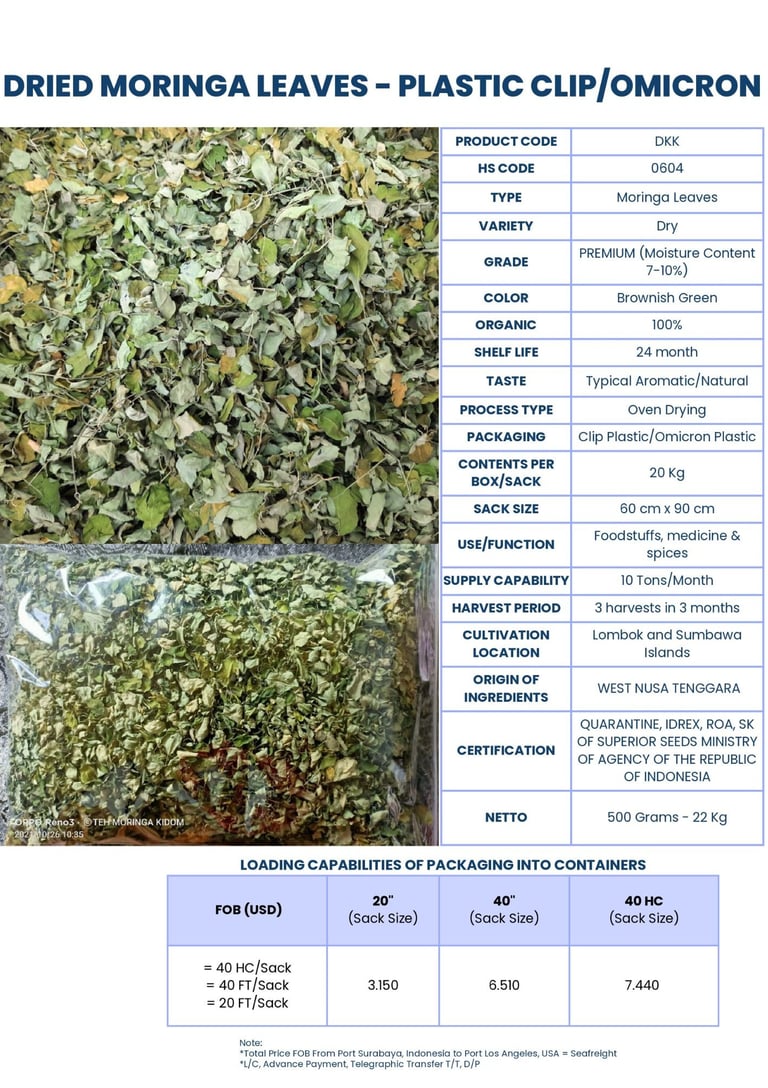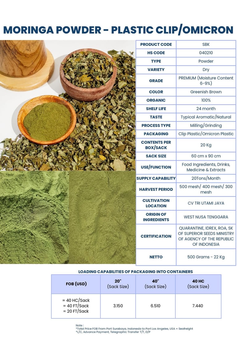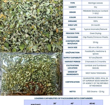 We export moringa products such as dried moringa leaves, dried moringa seeds, moringa powder, moringa powder tea, and moringa teabags. Our moringa products are of best quality and sourced from the best region in Indonesia.