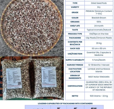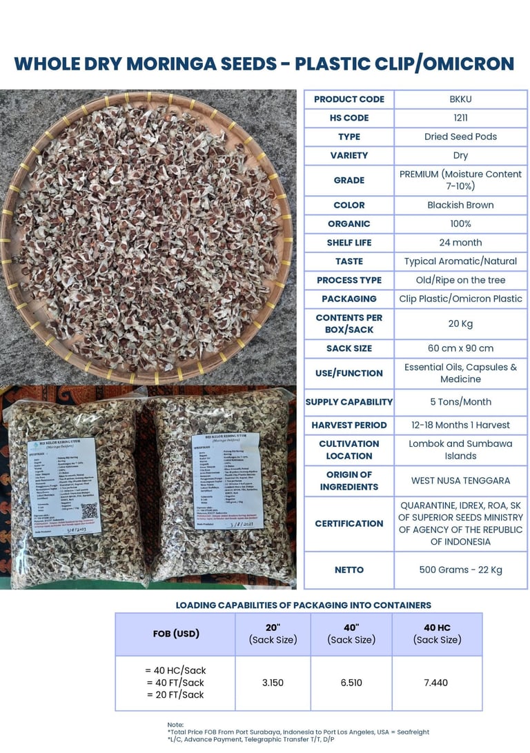 We also export whole dry moringa seeds. Our moringa seeds are of best quality as we source our products from the best region in Indonesia.